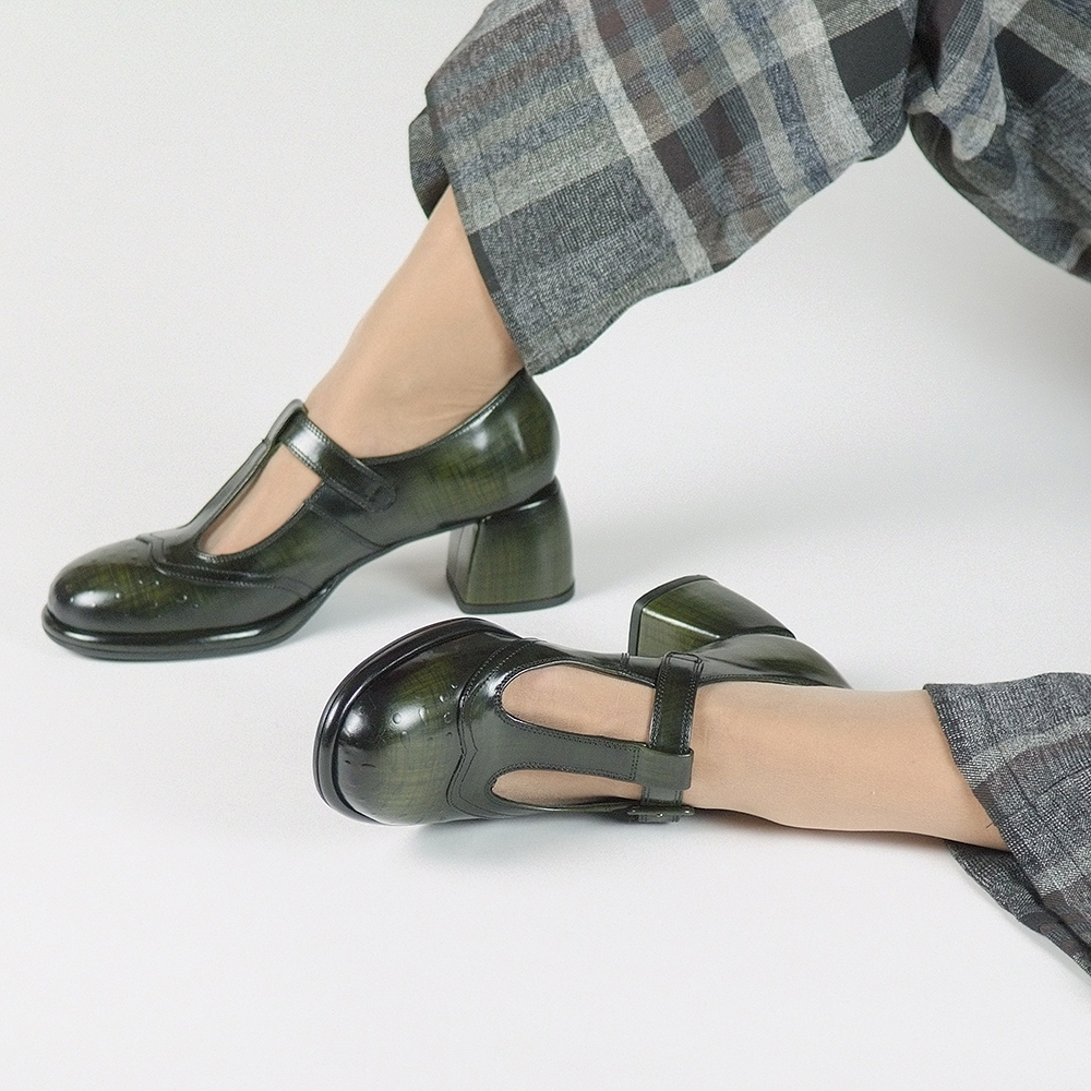 Γόβες Mary Jane δερμάτινες σε χακί με τακούνι 4,5 cm