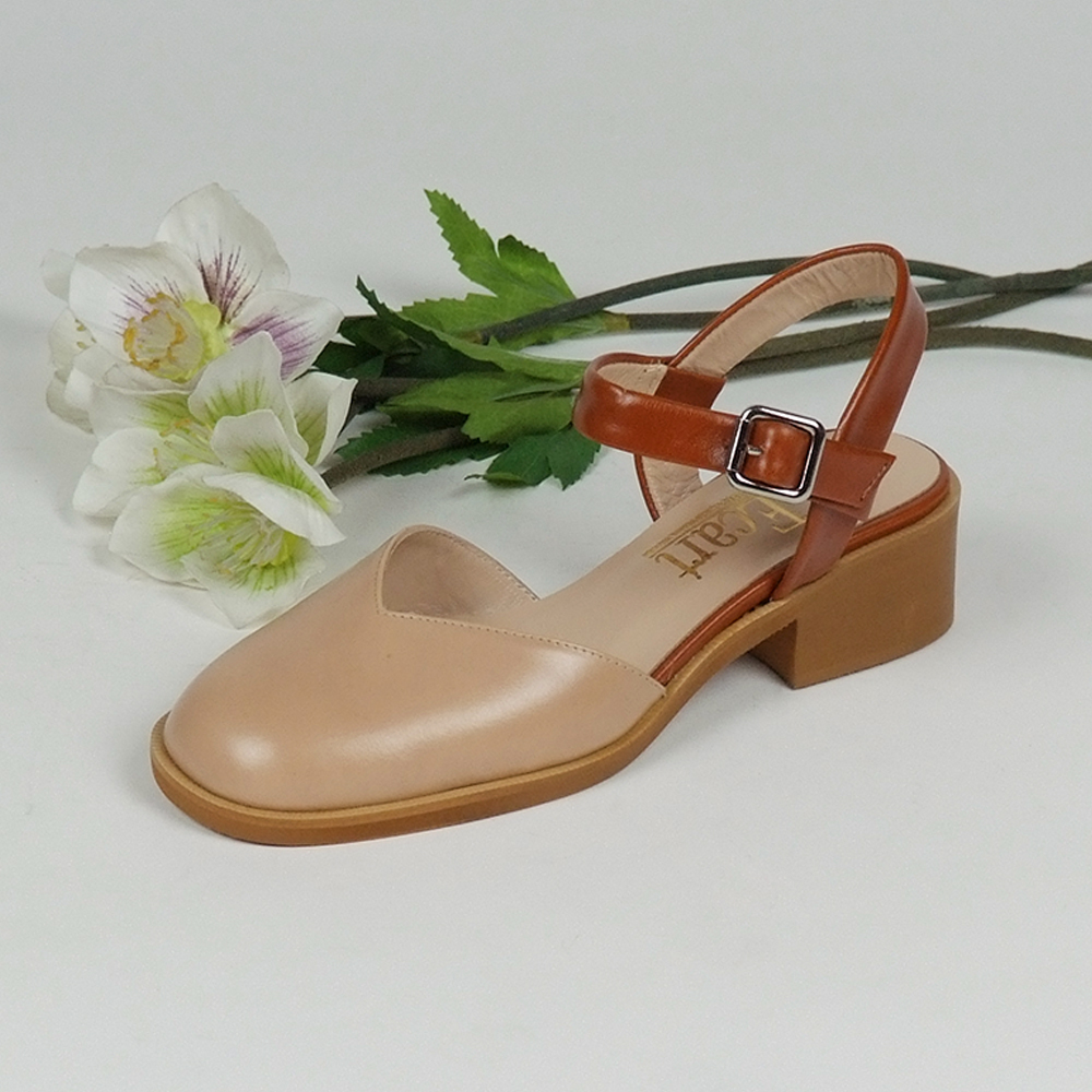 Γόβες δρεμάτινες με μπαρέτα σε μπέζ με ταμπά και τακούνι 4 cm