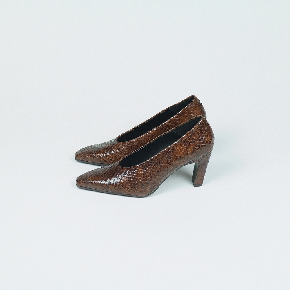 Γόβες δερμάτινες lizard effect σε καφέ με τακούνι 7cm.