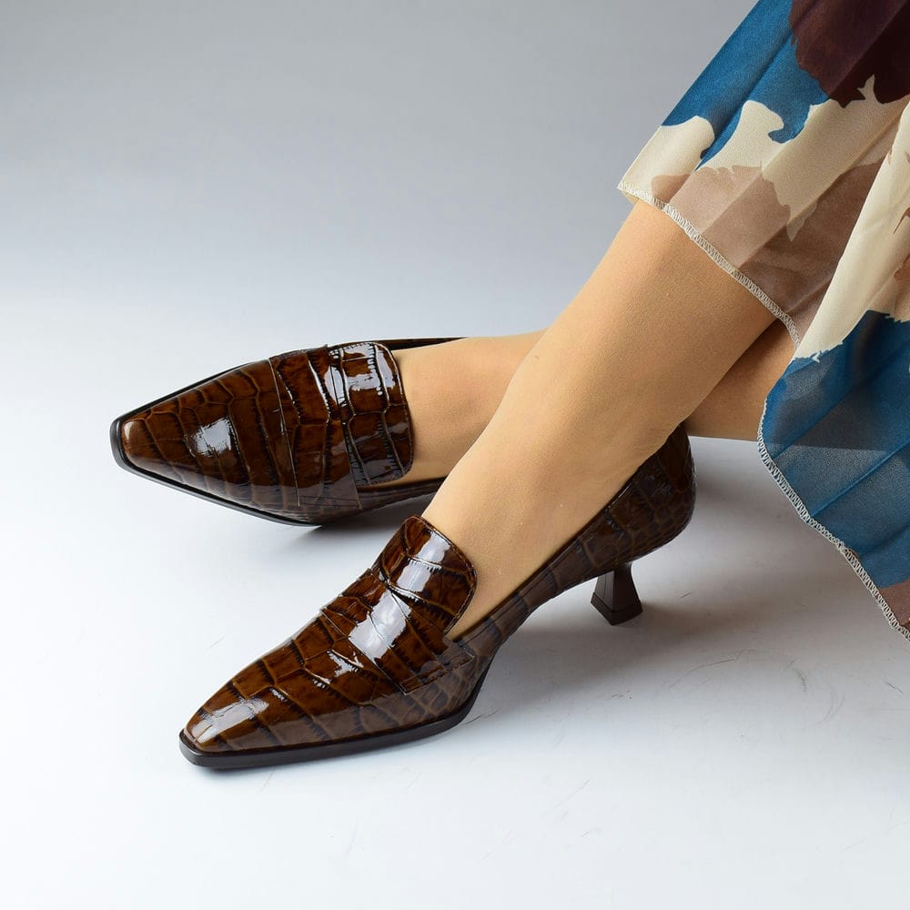 Γόβες δερμάτινες κροκό σε καφέ με τακούνι 4 cm