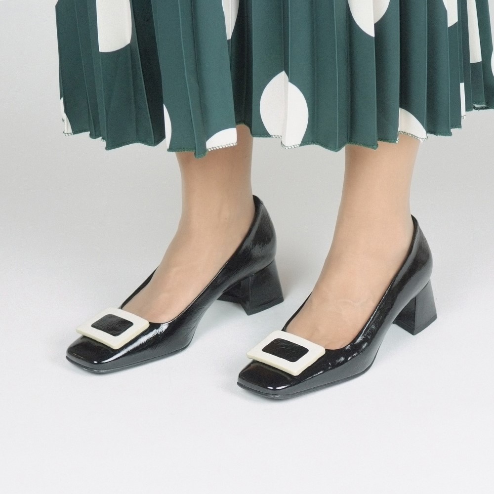 Γόβες δερμάτινες λουστρίνι μαύρες με off white λεπτομέρειες