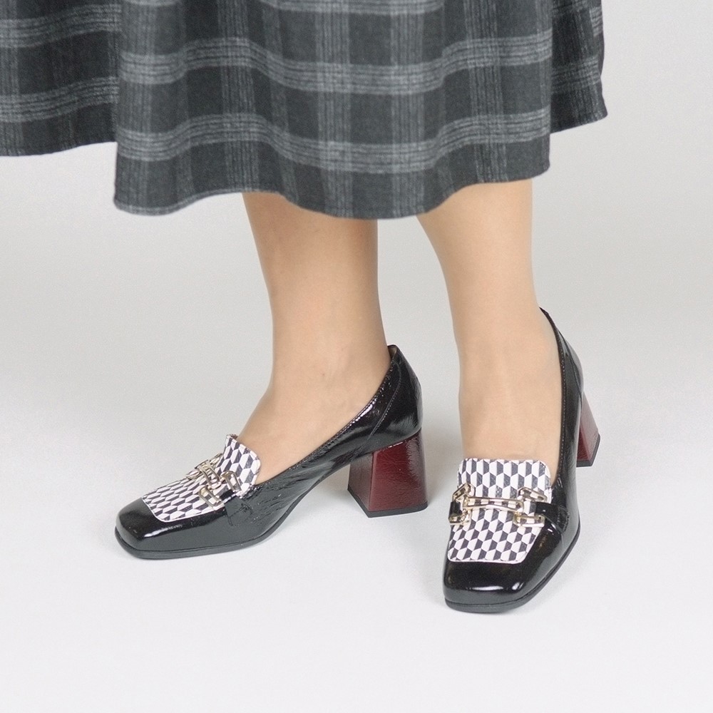 Μοκασίνια δερμάτινα σε μαύρο με μπορντό και ασπρόμαυρες λεπτομέρειες με τακούνι 5 cm