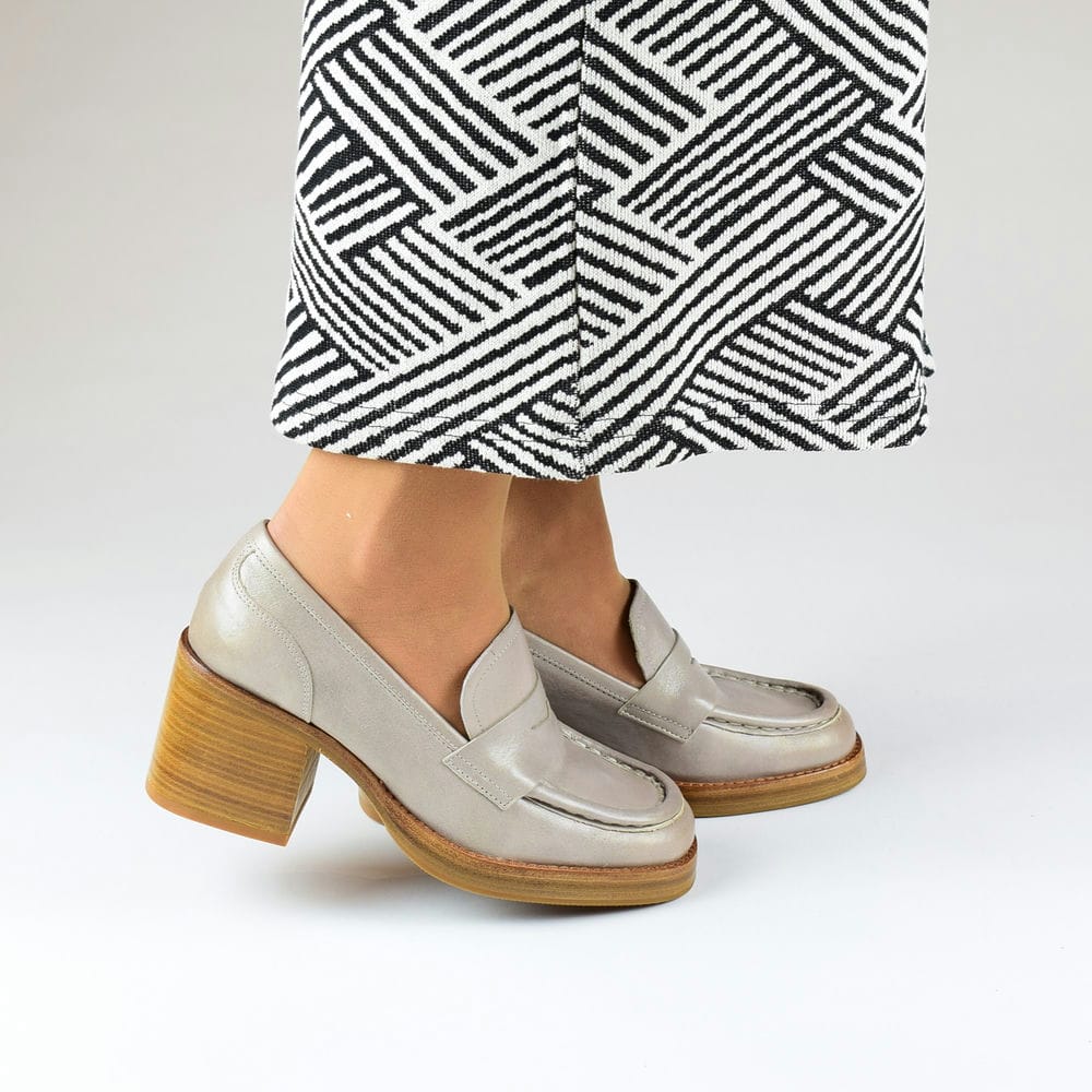 Μοκασίνια δερμάτινα σε γκρι μπεζ με  τακούνι 6 cm