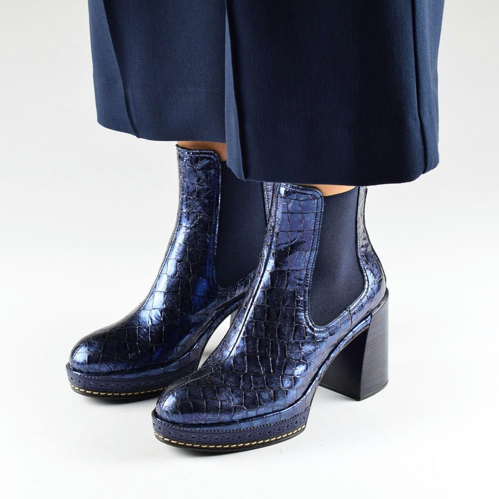 Μποτάκια Chelsea δερμάτινα κροκό σε μπλε με τακούνι 8 cm και πλατφόρμα 3 cm