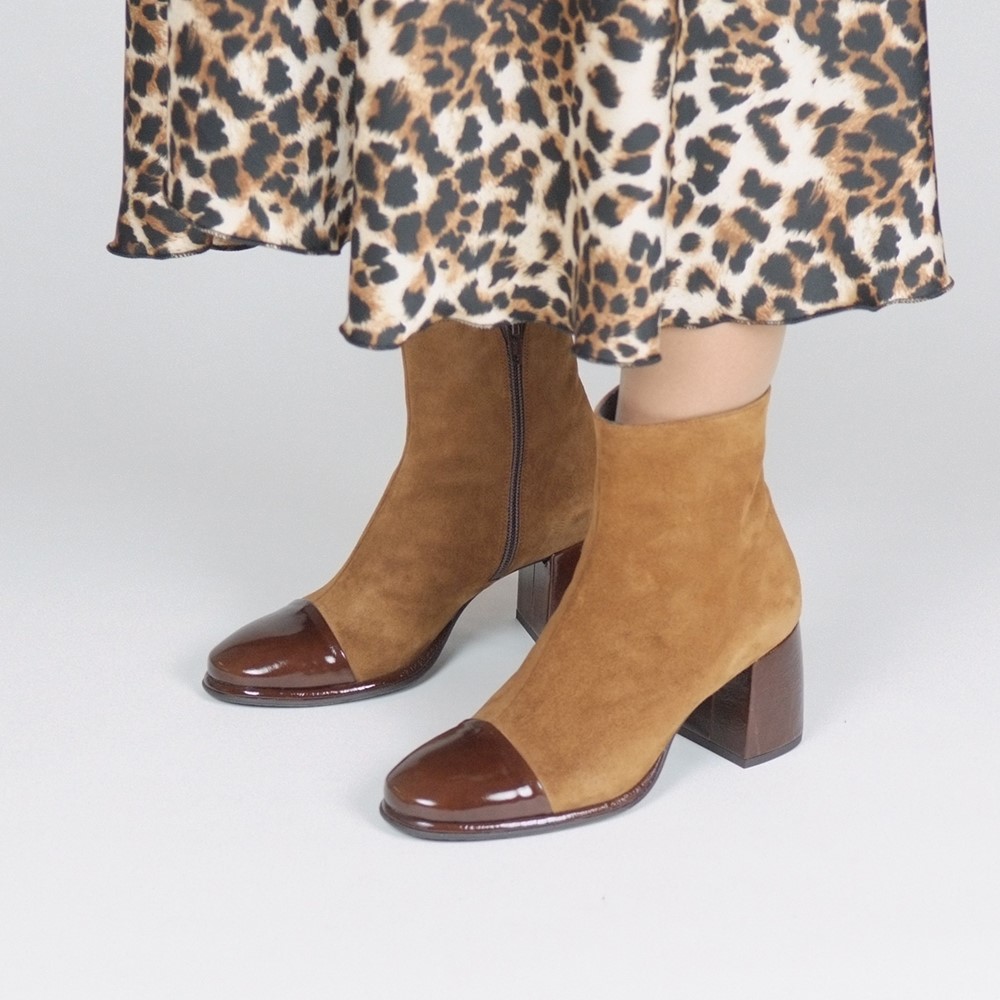 Μποτάκια δερμάτινα καστόρινα σε καφέ ταμπά με καφέ λουστρίνι λεπτομέρειες και τακούνι 5,5 cm