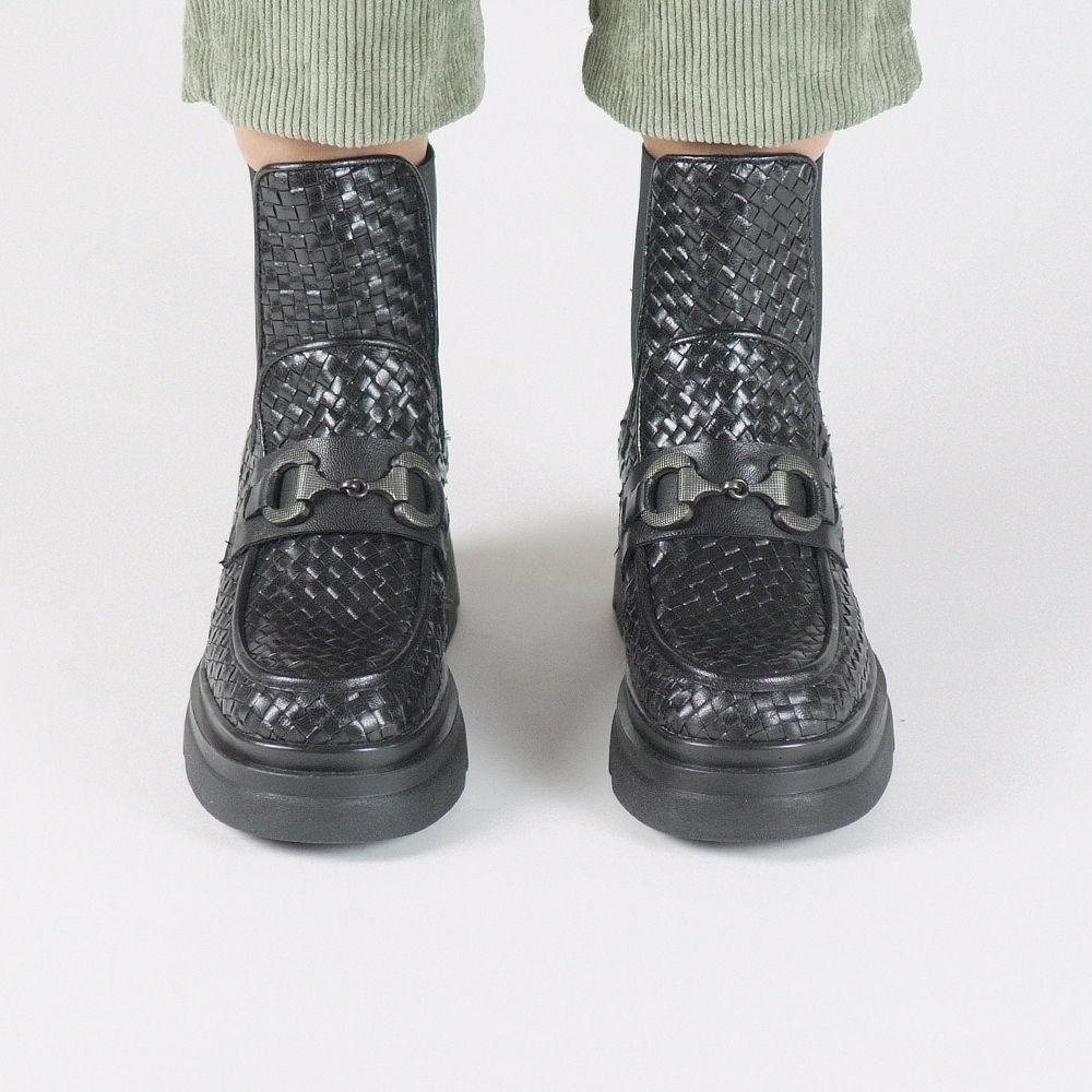 Μποτάκια δερμάτινα πλεκτά μαύρα με σόλα ελαστική και τακούνι 4 cm