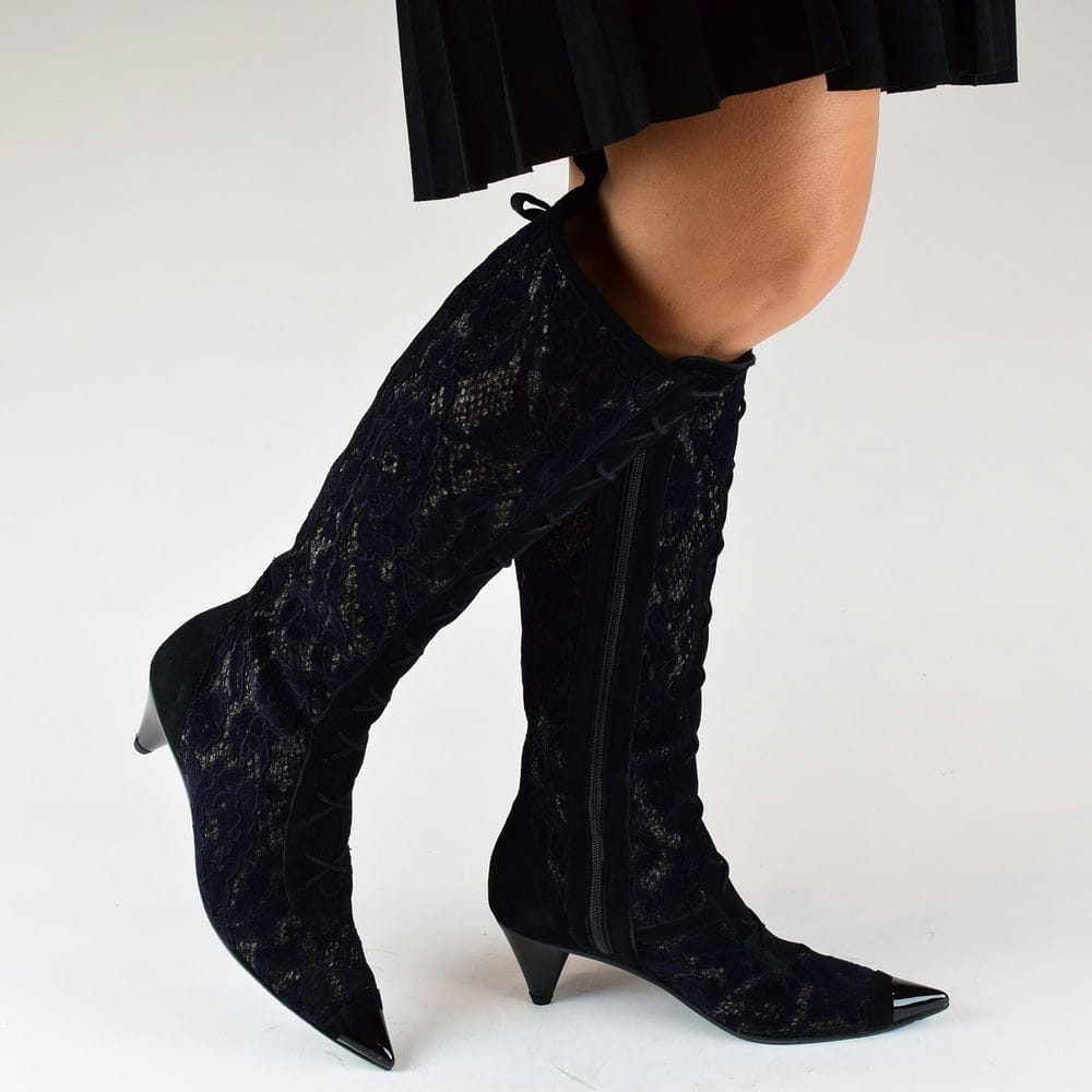 Μπότες  μαύρες από δαντέλα και δέρμα με κορδόνια και φερμουάρ σε 5 cm τακούνι