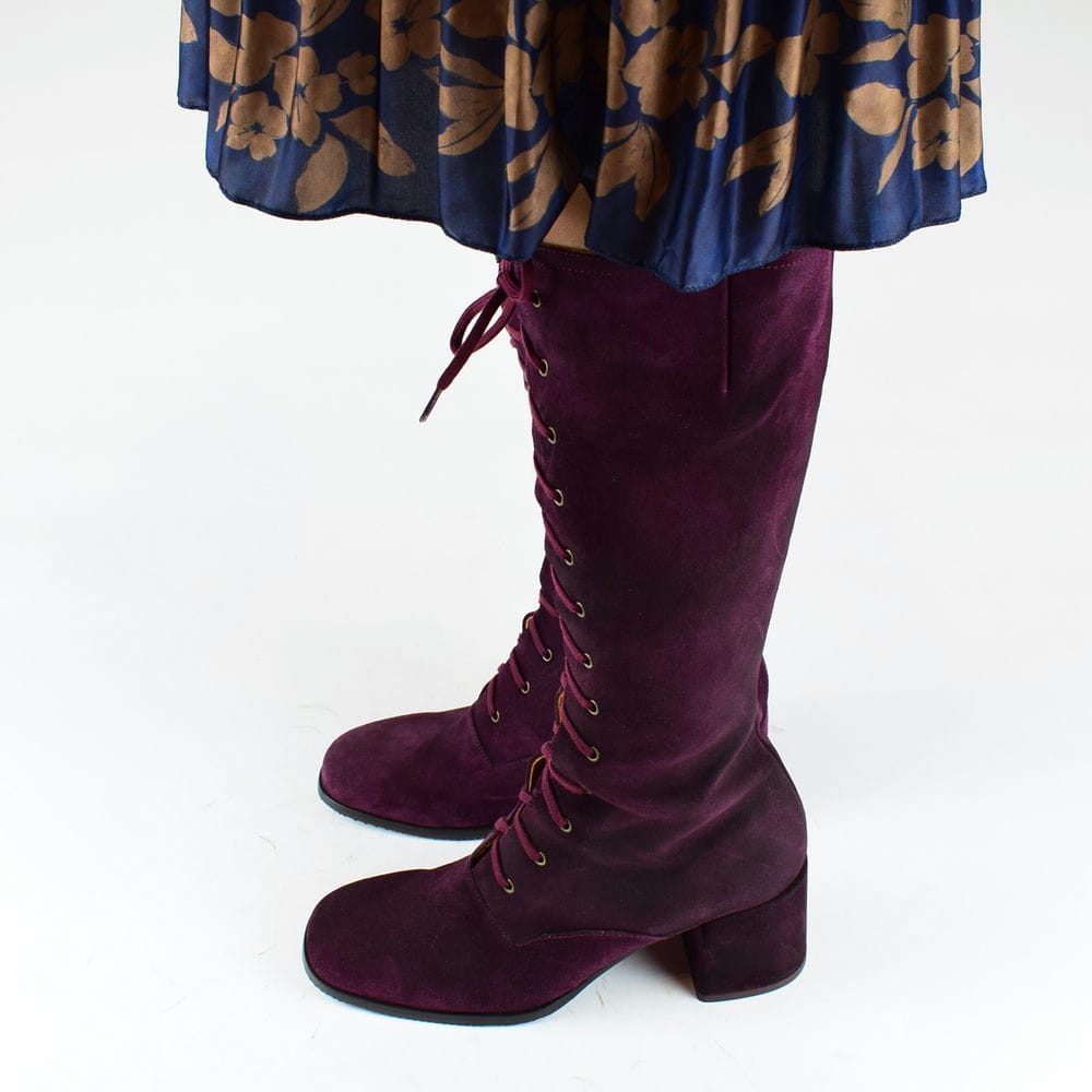 Μπότες δερμάτινες καστόρινες με κορδόνια και φερμουάρ σε μπορντό με τακούνι 5,5 cm
