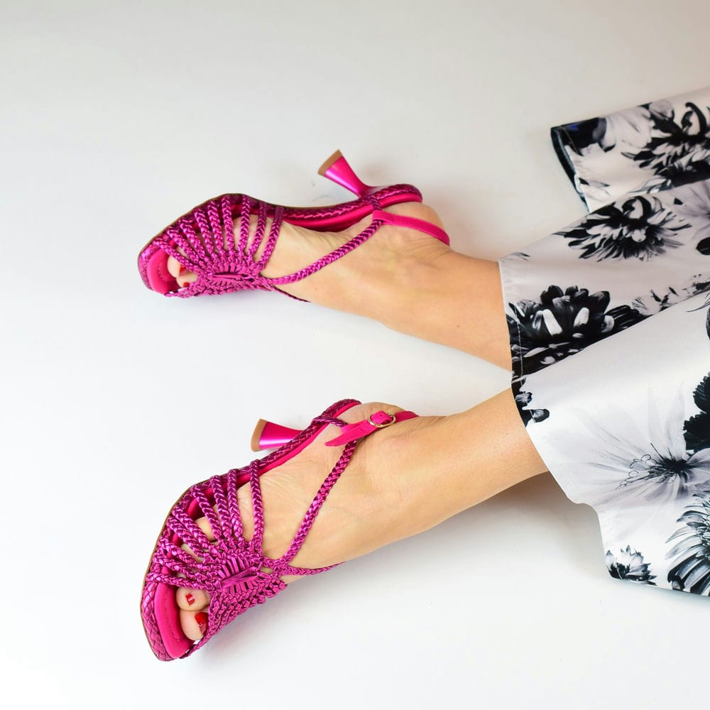 Πέδιλα δερμάτινα πλεκτά σε φούξια με τακούνι 7 cm