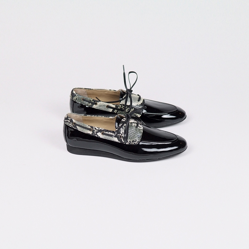 Boat loafers δερμάτινα σε μαύρο λουστρίνι με λεπτομάρειες από φείδι snake effect.